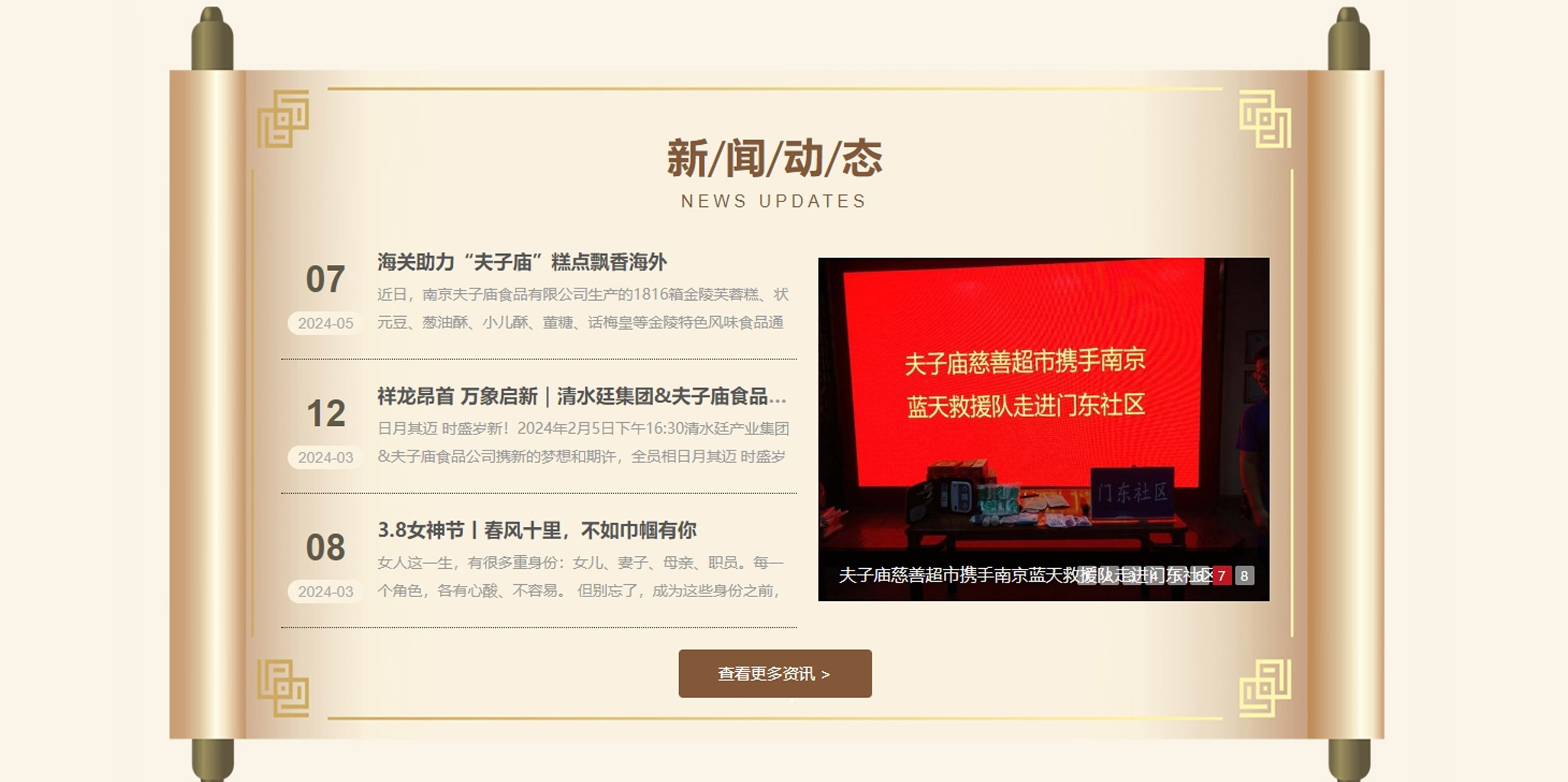 · 在【新聞中心】模塊,我們將發(fā)布關(guān)于夫子廟食品的官方新聞,更有與食品相關(guān)的要聞,便于各位用戶(hù)及時(shí)了解公司最新消息,更加了解夫子廟食品,了解來(lái)自南京的老字號(hào)糕點(diǎn)品牌。